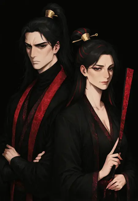 black chinese clothes, red scarf, black turtleneck, black hanfu, red trim, black coat, open coat, black pants, black boots