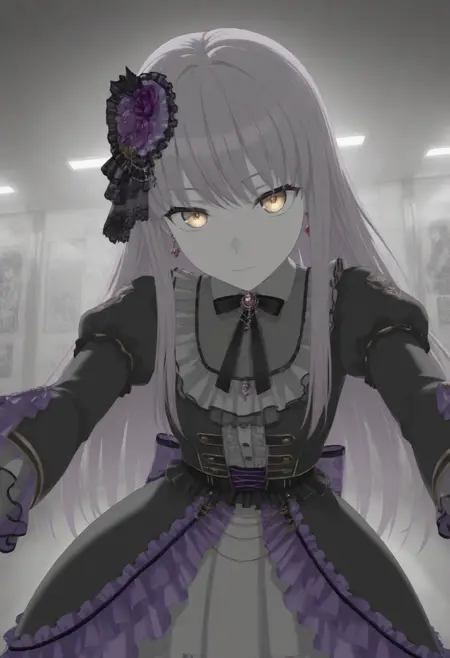 llt、紫のドレス、ロリータファッション、黒いリボン、コルセット、イヤリング、フィッシュネットのタイツ、フリル付きのドレス、フリル付きの袖、ふくらはぎの袖、リボン、ブローチ、ジュエリー、長袖、