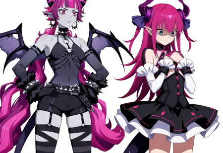 주요 태그: 색상이 있는 피부, 회색 피부, 다색 머리카락, 분홍색 머리카락, 매우 긴 머리카락, 낮은 트인테일, 분홍색 눈, 뾰족한 귀, 스파이크, 뿔, 악마 날개, 꼬리, 고리 귀걸이, 스파이크 목걸이, O-링, 분리된 소매, 팔 보호대, 스파이크 팔찌, 반바지, 벨트, 허벅지 긴 양말, 허리띠 고정대, 다리 보호대, 스파이크 발목 고리