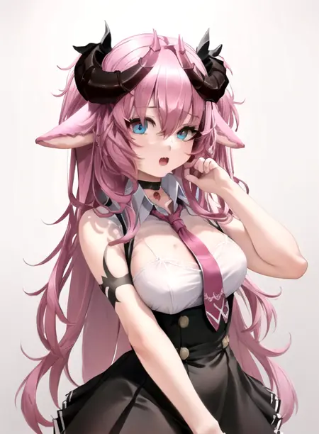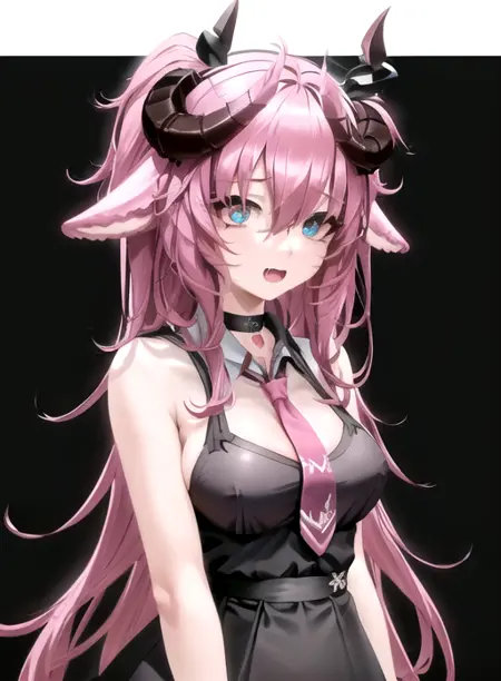 아이레리스, 긴 머리, 가슴, 파란 눈, 큰 가슴, 동물 귀, 눈 사이의 머리카락, 매우 긴 머리, 중간 크기의 가슴, 분홍 머리, 머리 띠, 머리 리본, 뿔, 목걸이, 가상 유튜버, 양쪽 위로, 검은 리본, 검은 목걸이, 머리카락에 가려진 눈썹, 말린 뿔, 양 귀, 꼬리,