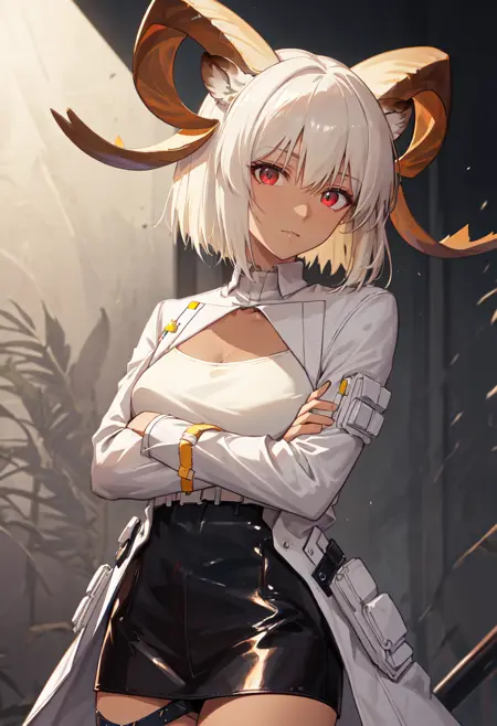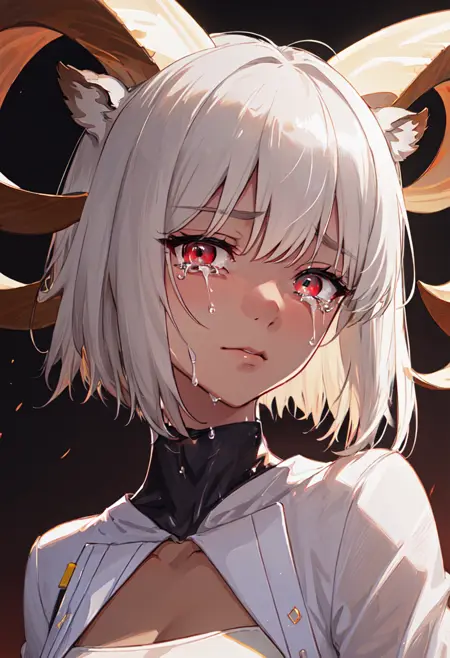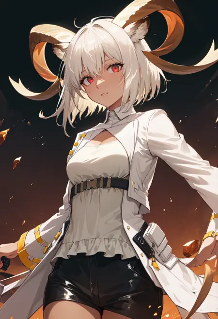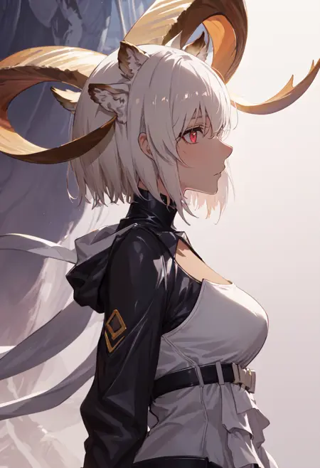 トリガー語はcarnelian_arknights、削減タグはdark-skinned_female, dark_skin, horns, animal_ears, goat_horns, goat_ears, goat_girl, white_hair, short_hair, red_eyes, breasts, large_breastsです。あるとき、一部の特徴(例:髪の色)が安定しない場合、これらをプロンプトに追加してください。