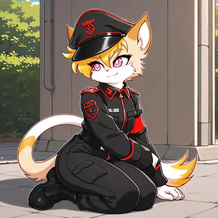 Talia(character), cat, male, femboy, no humans, pink eyes, blonde hair, fluffy neck, pick body markings,
