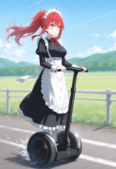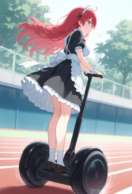 トリガーワードのみでも出力できますが、車両が静止した状態になるため、臨場感を出すために standing, holding, outdoors, wind, speed lines, driving, motion lines, floating hair などからお好みの要素をお選びください。