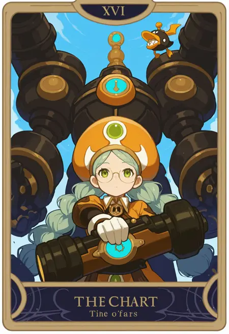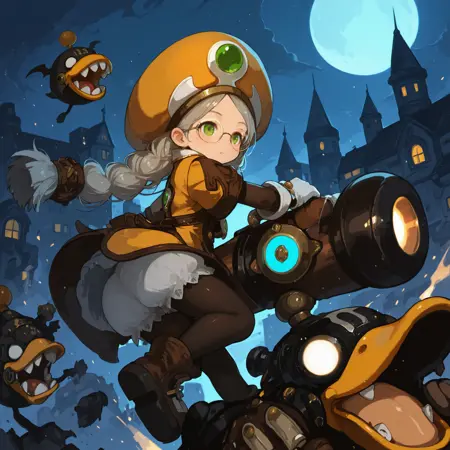프롬프트: AcadDN01, holding a cannon, Mecha Duck, orange hat, on a ship lora:academic\_dragonnest:1