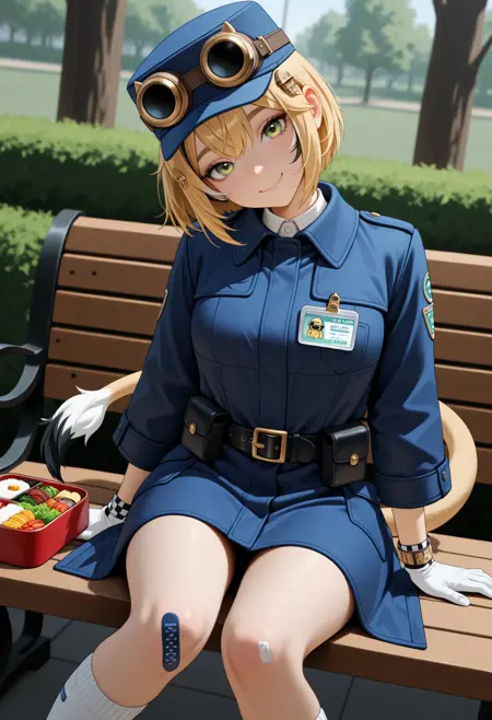 D00byDef, 绿色眼睛, 金色头发, 带条纹的侧发, 黑色头发, 短发, 头发装饰, 蓝色帽子, 头戴护目镜, 蓝色外套, 员工卡, 黑色腰带, 腰带包, 白色手套, 手镯, 膝盖上的创可贴, 白色袜子, 尾巴