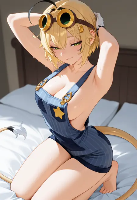D00byDef, 绿色眼睛, 金色头发, 带条纹的侧发, 黑色头发, 短发, ahoge, 头发装饰, 护目镜戴在头上, 裸露的背带裤, 背带短裤, 垂直条纹背带裤, 白色手套, 尾巴