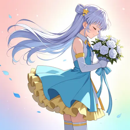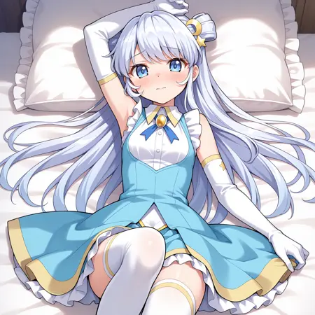 magical girl,official outfit,white gloves,elbow gloves,white thighhighs,blue dress,brooch,white shirt,collared shirt,sleeveless shirt,neck ribbon,blue ribbon,frills,frilled shirt,