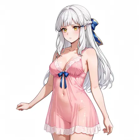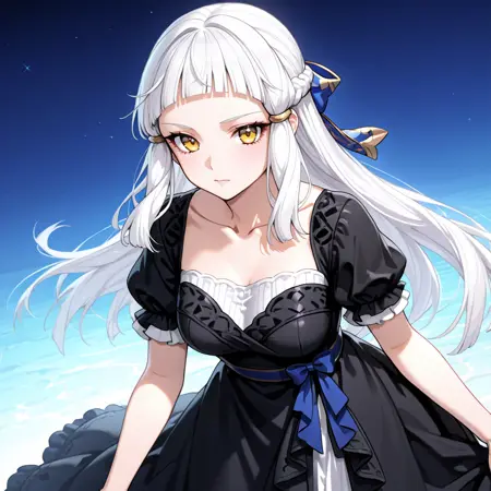 - 黒いドレス付きTrigger: PenthesileaBlackDress, 1girl, black dress, yellow eyes, long hair, white hair, hair bow, collarbone, braid, puffy short sleeves, blunt bangs, blue bow, sidelocks, hair ornament, puffy sleeves, breasts, frills, cowboy shot