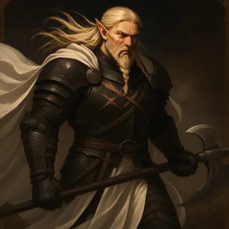 奇幻卡牌:富有细节的数字绘画风格奇幻插画。角色采用强烈的戏剧性光影、深邃阴影和温暖的土色调。材质纹理精细刻画,尤其在金属、皮革和编发发束上表现突出。盔甲与武器上刻有精细的北欧或凯尔特风格图案。背景为魔法般的星光氛围,边缘饰以华丽的金色边框。整体构图类似高奇幻角色肖像或收藏卡牌,强调鲜明的表情与英雄气概。特点包括: