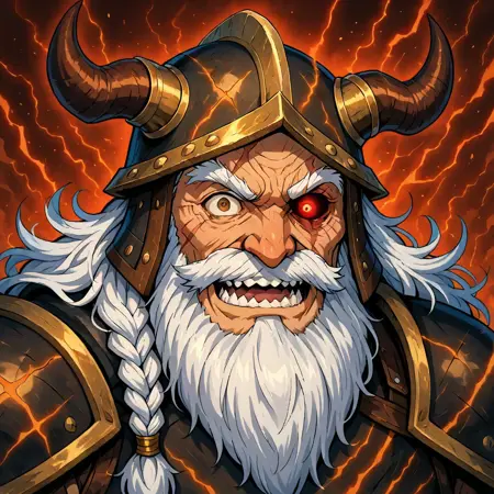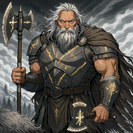 Fantasy Card: Digital painting in a richly detailed fantasy illustration style. The character is depicted with strong dramatic lighting, deep shadows, and warm, earthy tones. Textures are finely rendered, especially in the metal, leather, and braided hair. Intricate Norse or Celtic-inspired patterns are engraved on the armor and weapons. The background features a magical, star-lit ambiance framed with ornate golden borders. The overall composition resembles a high-fantasy character portrait or trading card, emphasizing bold expression and heroic stature that features: