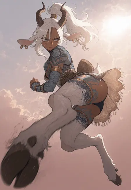 有时它会加上手臂上的毛发,尽管它并未在带有“山羊女孩”标签的图像上进行过训练,但将“furry arms”加入负面提示似乎能一贯地阻止这一现象。另外……一些(可能是经过毛茸茸风格训练的?)风格LoRA特别想给她加上四条腿。提前警告:如果发生这种情况,请降低强度。 我不是技术专家,但据我观察,提高CFG值似乎也能消除这个问题。