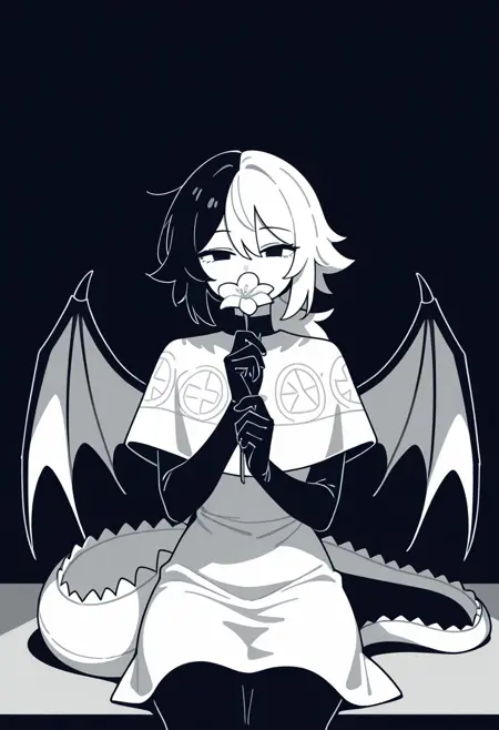 ALL TAGS TO USE: (ZipFPE, 1girl, solo, medium hair with ponytail, black and white hair, 2+2=8 hairpin, black eyes, white dress, white poncho, dragon wings, dragon tail,)