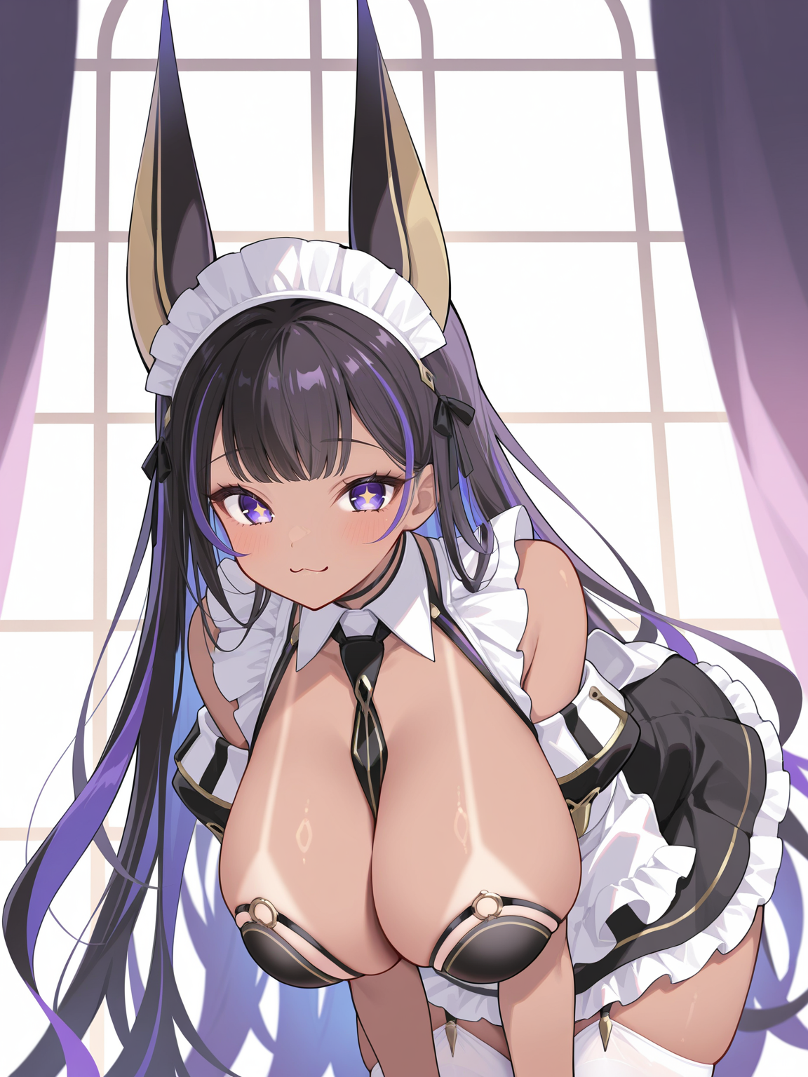 メイド:azmcleo、非常に長い髪、黒髪、紫髪、内側に色付きの髪、紫目、星形の瞳、ジャッカル耳、肌の濃い女性、日焼け跡、大きな胸、冠、メイド服、黒いドレス、Oリング、衣装カットアウト、ハーネス、肩出し、フリルのドレス、胸元のライン、メイドの頭飾り、メイドのエプロン、胸の間のネクタイ、黒いネクタイ、黒い手袋、ハーフグローブ、ガーターストラップ、白いハイソックス