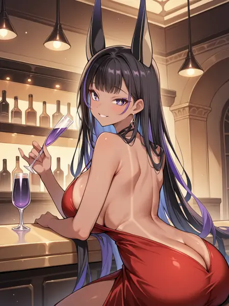 Apperance: azmcleo, very long hair, black hair, purple hair, colored inner hair, purple eyes, star-shaped pupils, jackal ears, dark-skinned female, tanlines, large breasts