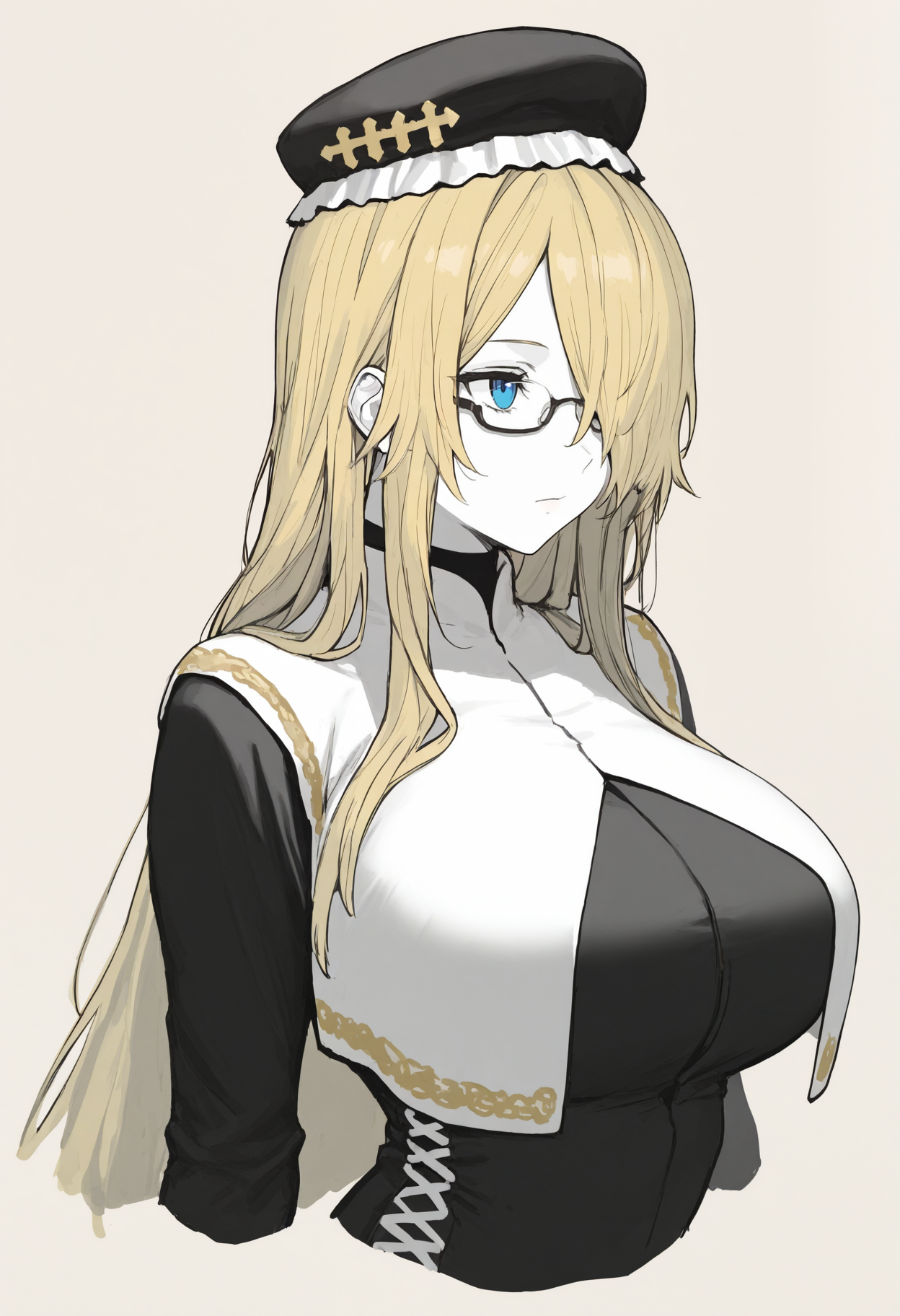 • 月之诅咒2: dmCOTM,金色头发,长发,军帽,发饰,头发遮住一只眼睛,蓝眼睛,眼镜,大乳房,中心褶边,白色领结,黑色紧身衣,蓝色衬衫,胸下部,白色外套,长袖,褶边袖,黑色手套,及膝靴,高跟靴,白色鞋履