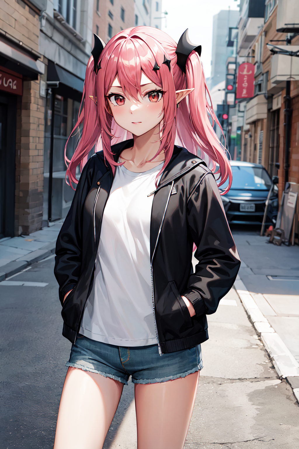 아우트핏1aakrul, 긴 머리, 양쪽 올려묶기, 머리 장식, 뾰족한 귀, 작은 가슴, 프릴 칼라, 빨간 리본, 어깨 노출, 검은 드레스, 분리형 소매, 소매가 손목을 넘음, 허벅지 스타킹