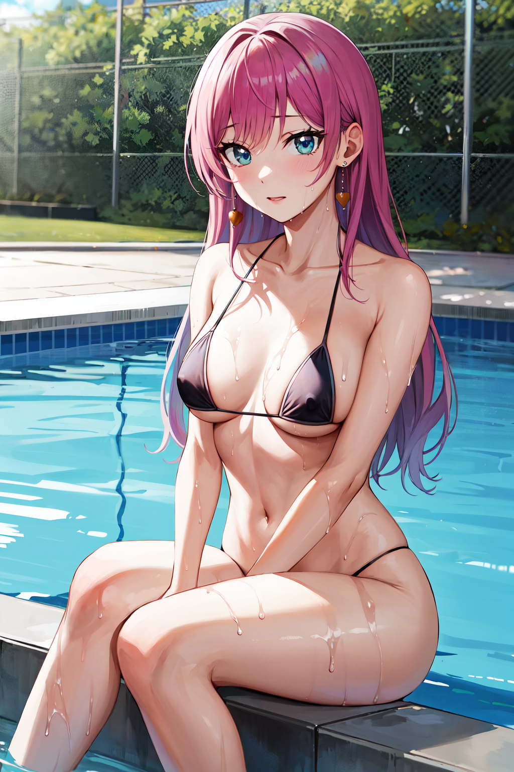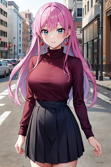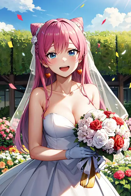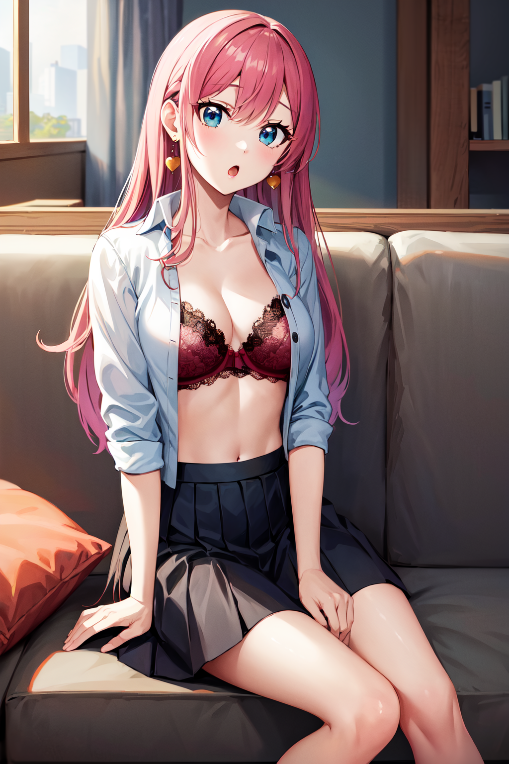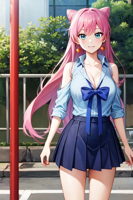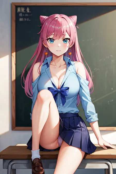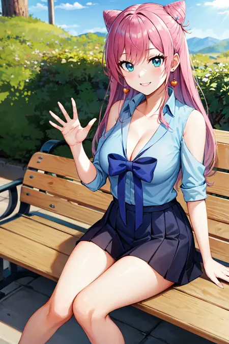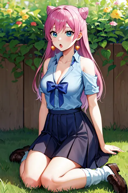 服装1aaakari, 长发, 锥形发髻, 耳环, 中等胸部, 挺胸, 蓝色衬衫, 蓝色蝴蝶结, 肩部镂空, 百褶裙, 蓝色裙子