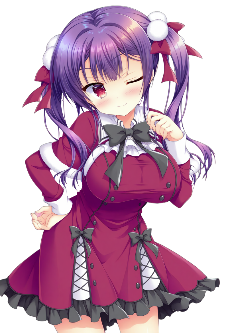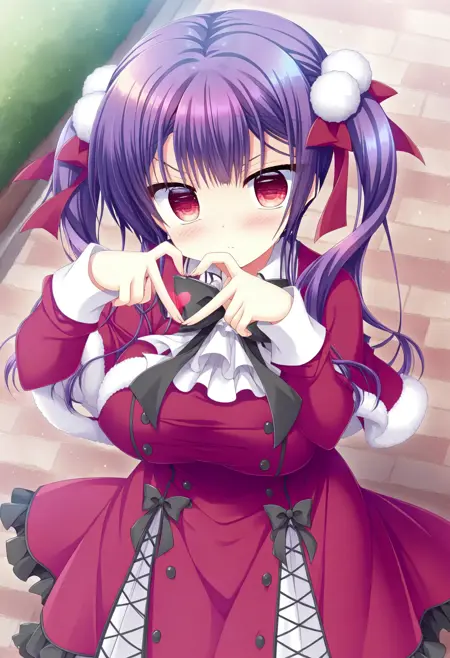 触发词: c-sasa、长发、紫色头发、红眼、双马尾、发带、毛球发饰,