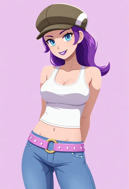 키워드는 da1sybr이며, 기본 옷차림으로는: 보라색 머리카락, 파란 눈, 흰색 텅스탑, 청바지, 배꼽, 목걸이, 분홍색 벨트, 금색 버클, 분홍색 하이힐, 팔찌를 사용하세요.