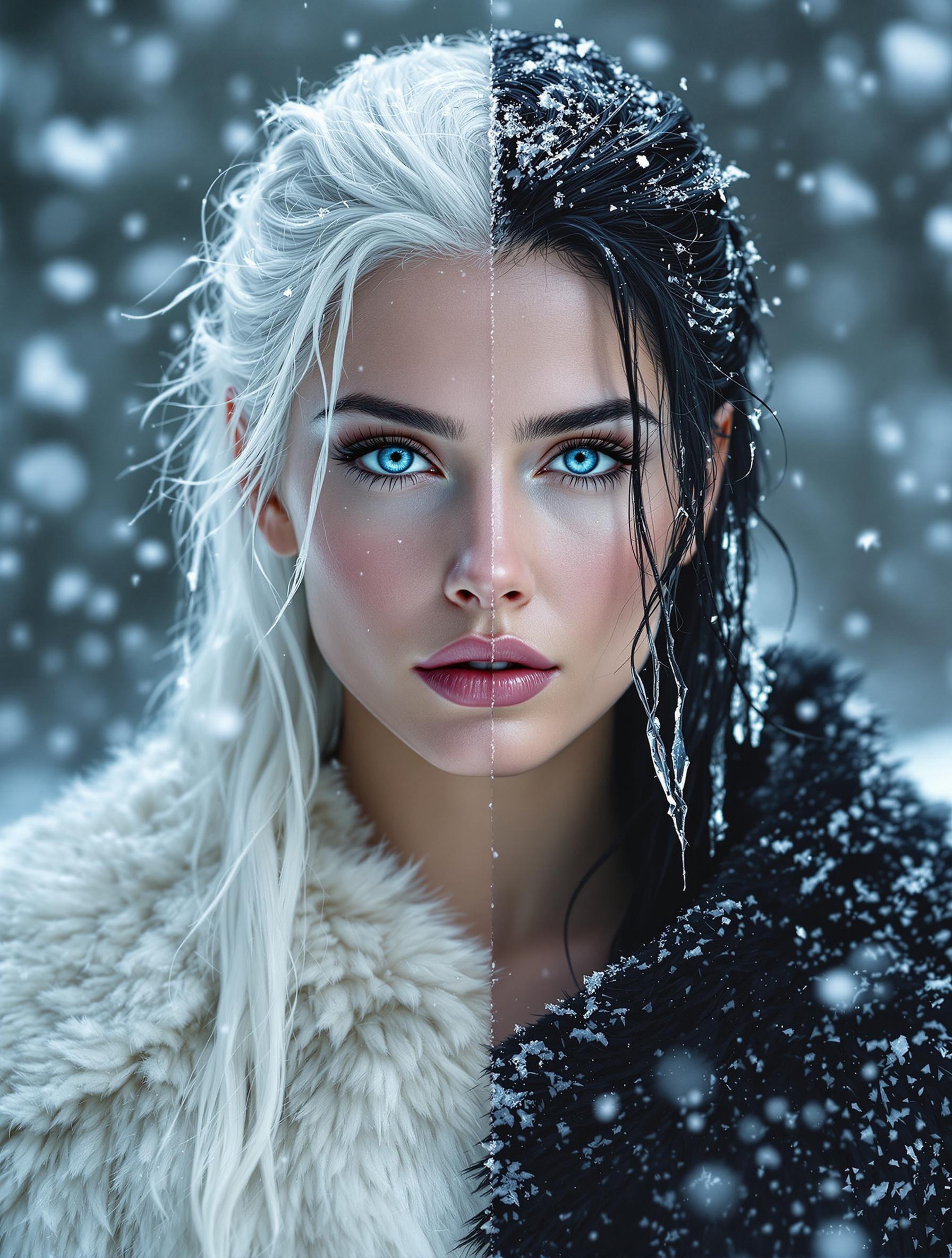• Viewer’s left side: radiant, youthful, living — white hair, smooth pale skin, serene beauty