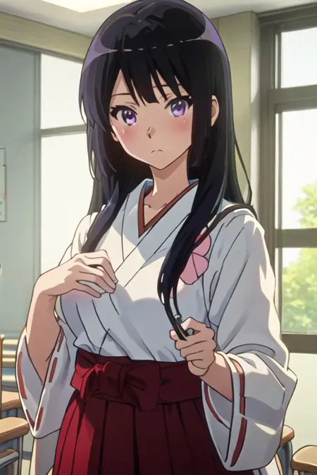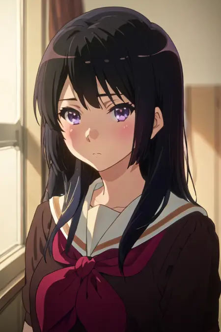 The trigger word is kousaka_reina_soundeuphonium, and the pruned tags are black_hair, long_hair, purple_eyes. When some features (e.g. hair color) are not so stable at some times, you can add these them into your prompt.