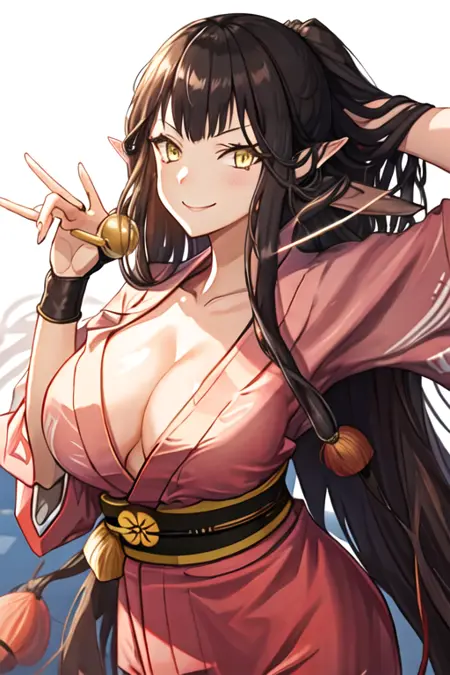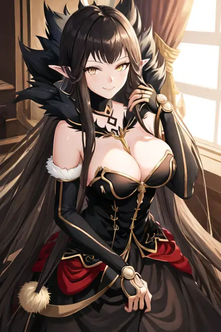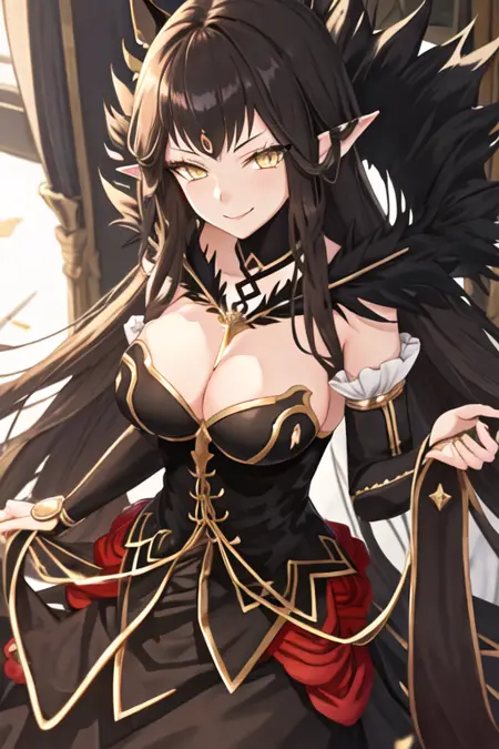 The trigger word is semiramis_fgo, and the recommended tags are best quality, masterpiece, highres, solo, {semiramis_fgo:1.15}, long_hair, pointy_ears, yellow_eyes, black_hair, breasts, large_breasts, very_long_hair, cleavage, bangs, smile.