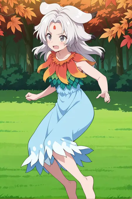 collarbone, green vest, blue dress, sleeveless dress, leaf clothing, red leaf, barefoot,