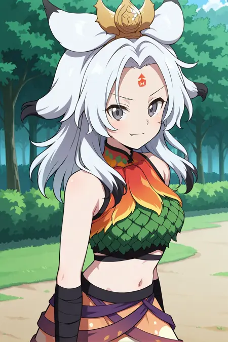 houjuu chimi, 1girl, solo, grey eyes, white hair, long hair, parted bangs, fang, forehead mark,