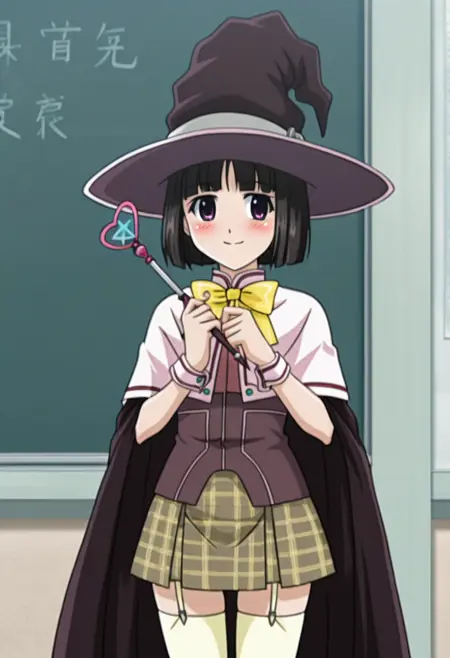 Trigger = zzyukarisendozz, Tags = hat, short hair, black hair, 1girl, solo, witch hat, bob cut, purple eyes, school uniform, cape, wand, smile, thighhighs, plaid, skirt, garter straps, plaid skirt, blush, yellow bow, zettai ryouiki