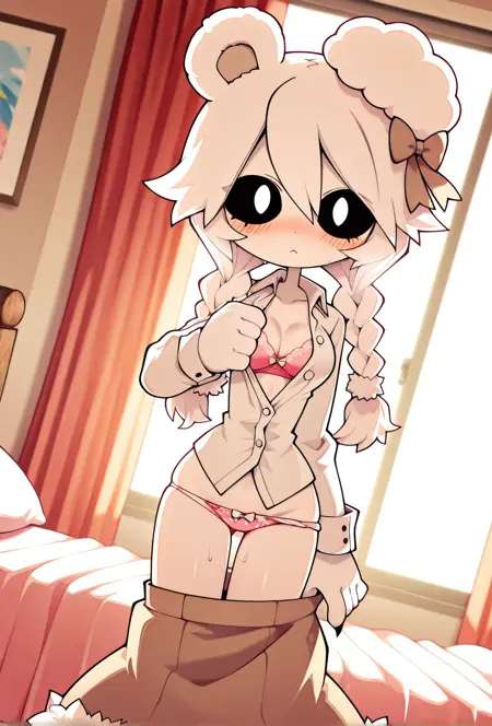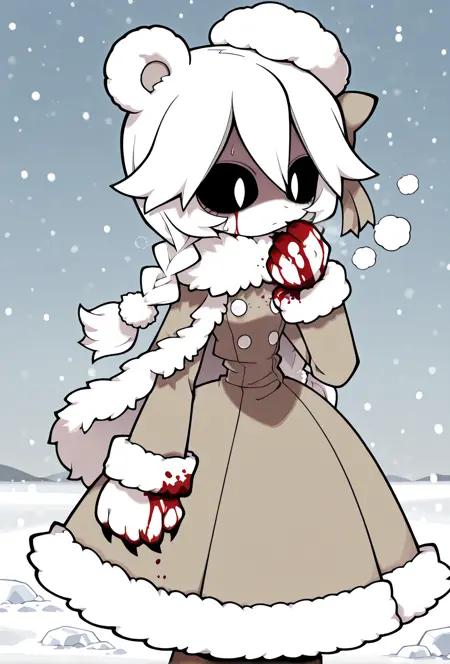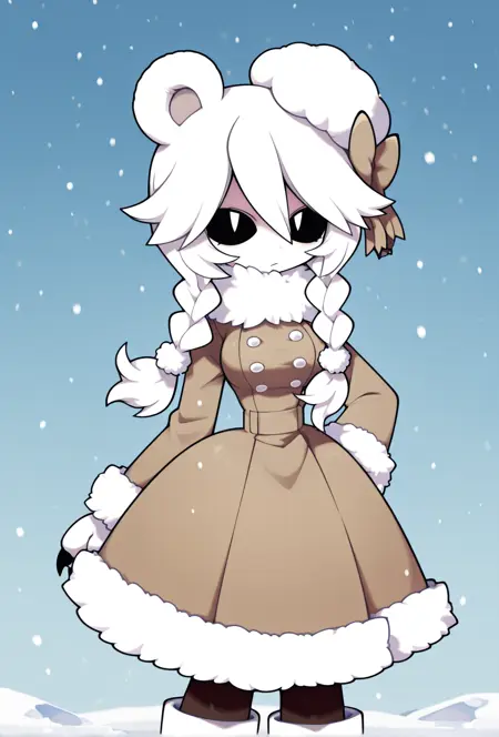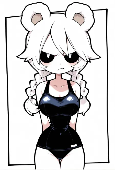 1girl,Rocma, solo, white_skin,pale_skin, headwear, twin_braids, black_sclera, white_pupils, braid, bear_ears, animal_ears, white_hair, bow, dress, long_hair, fur_trim, bear_girl, claws, boots