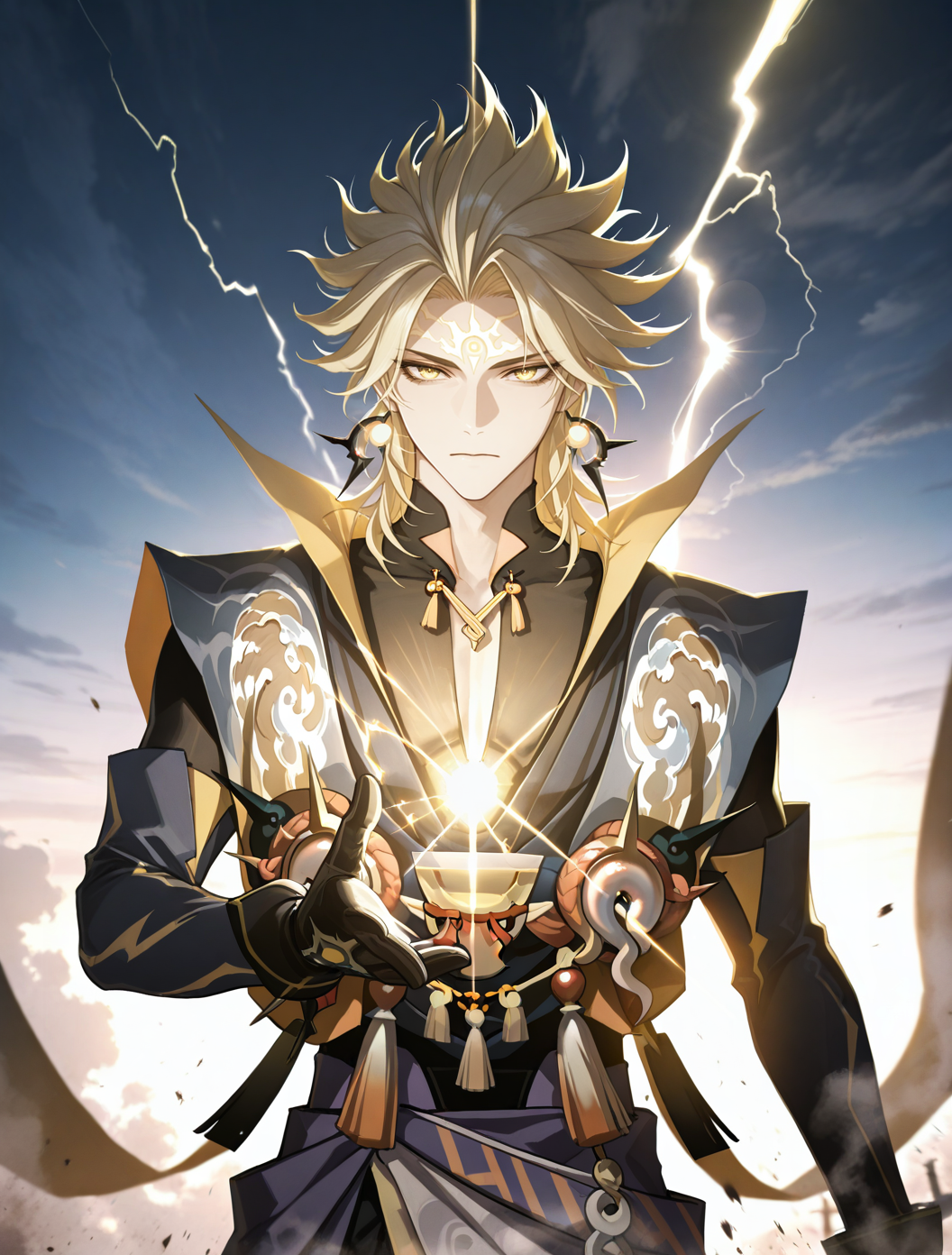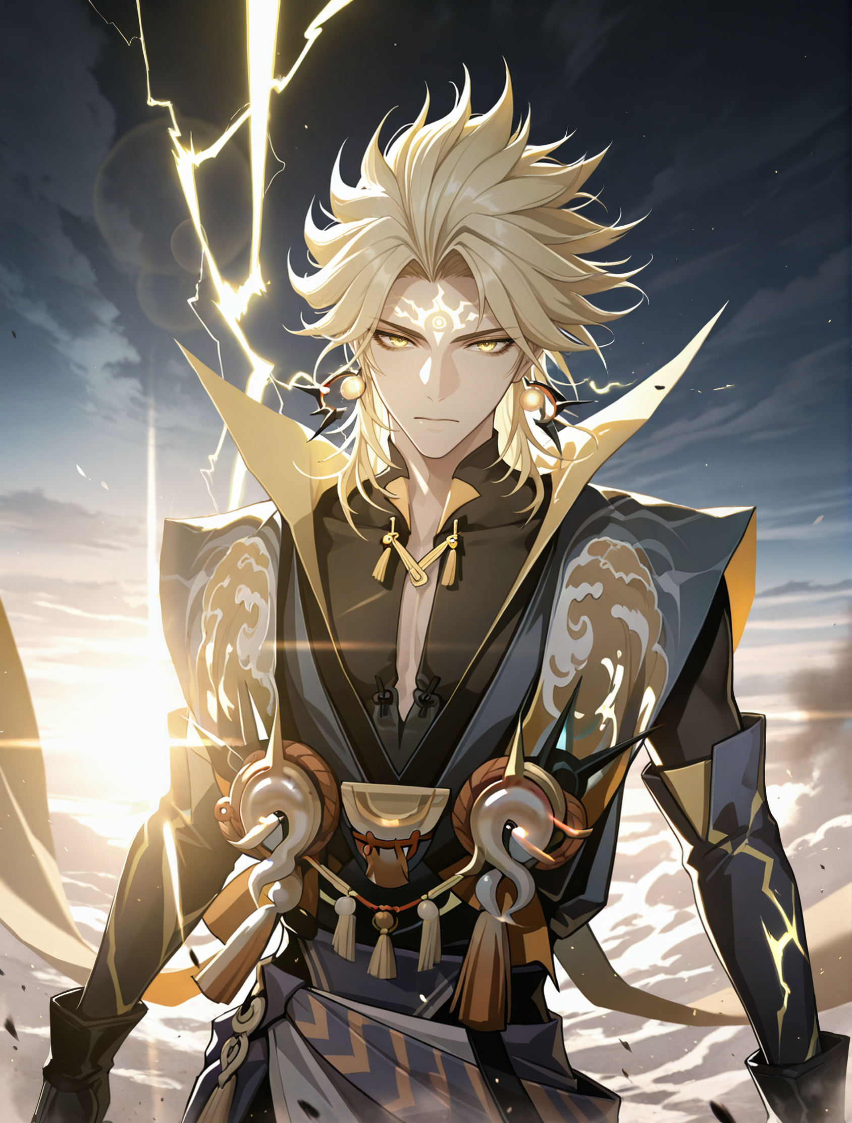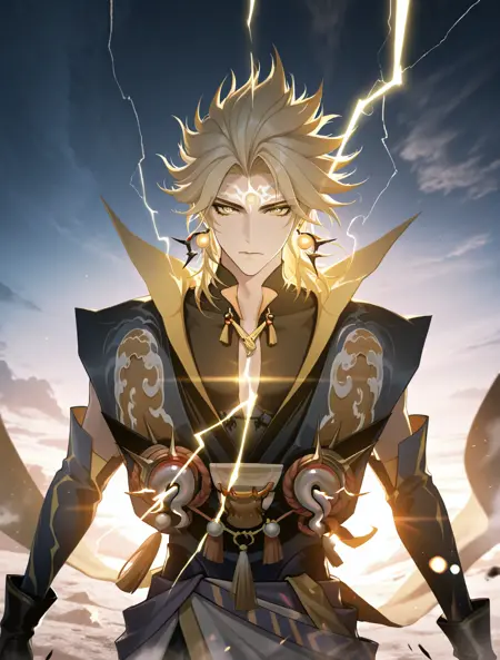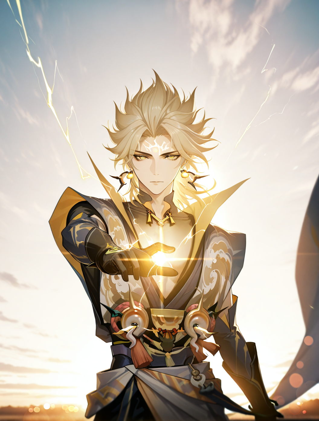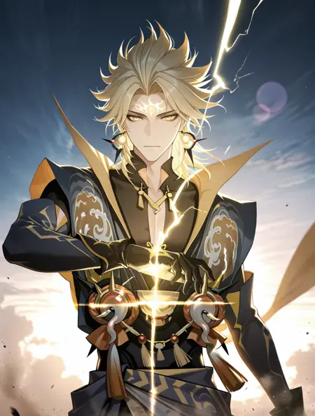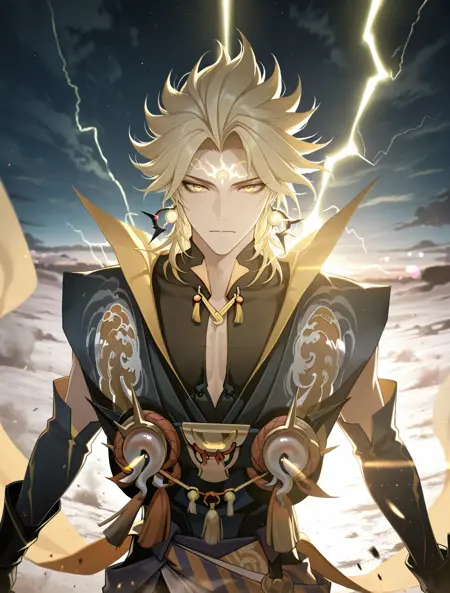 提示词:susanoo \(onmyoji\),blonde hair,yellow eyes,facial mark,forehead mark,earrings,jewelry,gloves,black gloves,spiked hair,bishounen, 雷电:electricity,lighting,