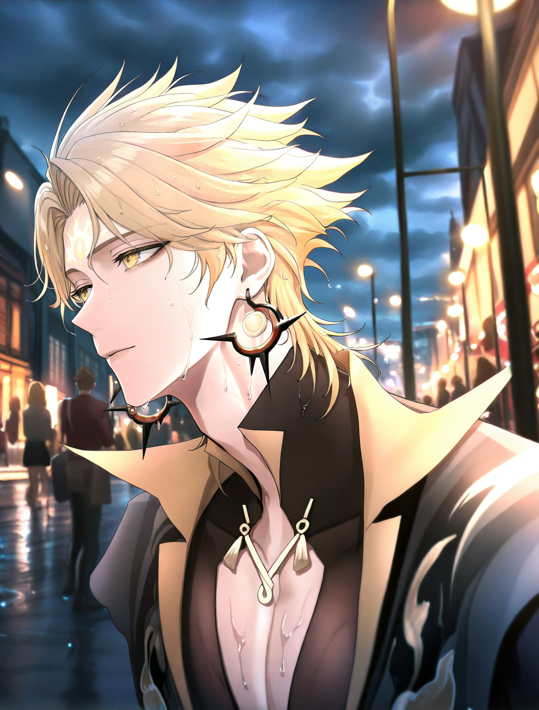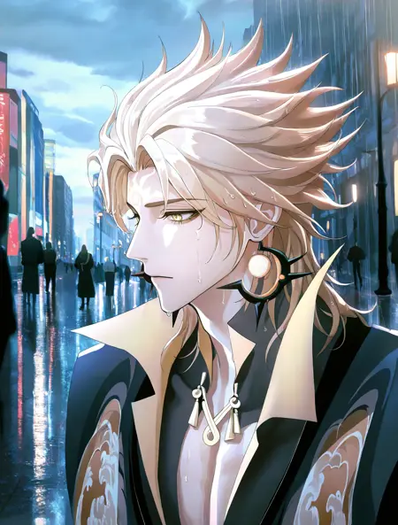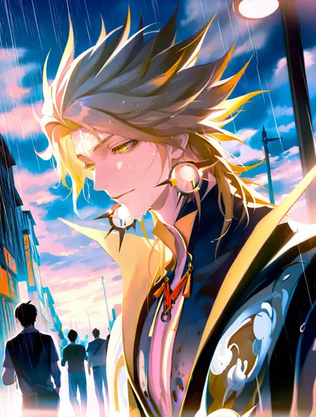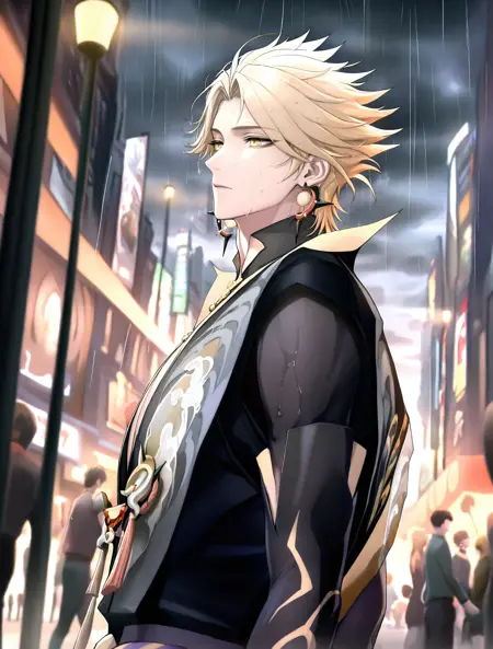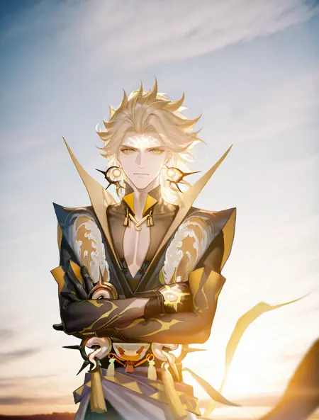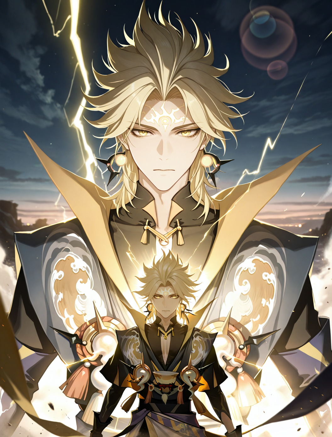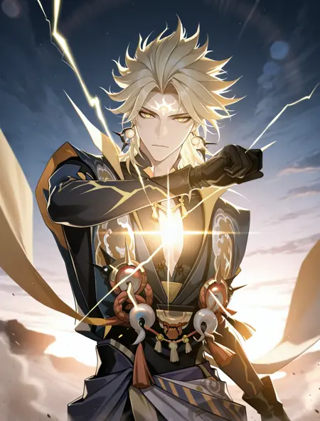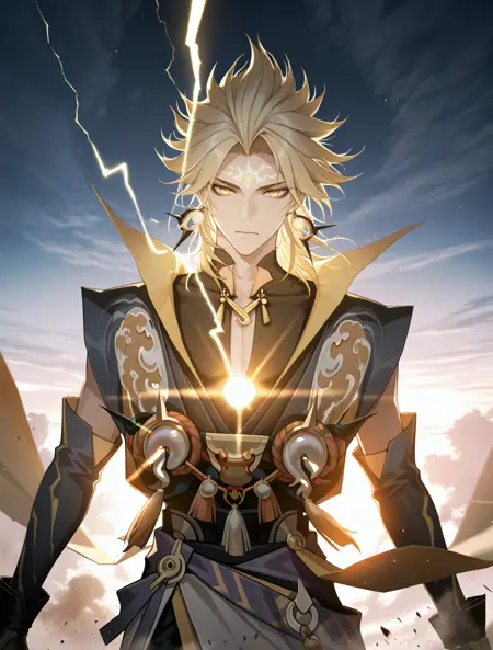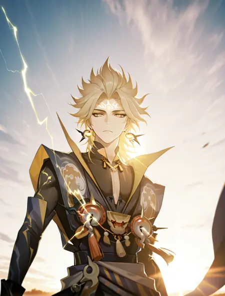 提示词:susanoo \(onmyoji\),blonde hair,yellow eyes,facial mark,forehead mark,earrings,jewelry,gloves,black gloves,spiked hair,bishounen, 雷电:electricity,lighting,