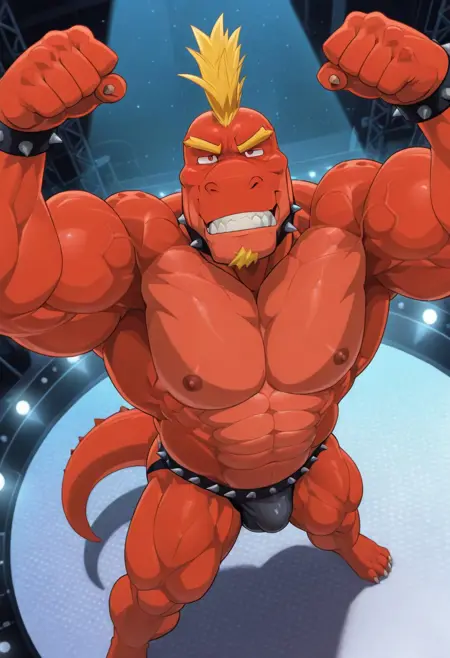 强化提示:"恐龙,红色皮肤,金发,莫霍克发型,肌肉发达,bara,男子气概,成熟"