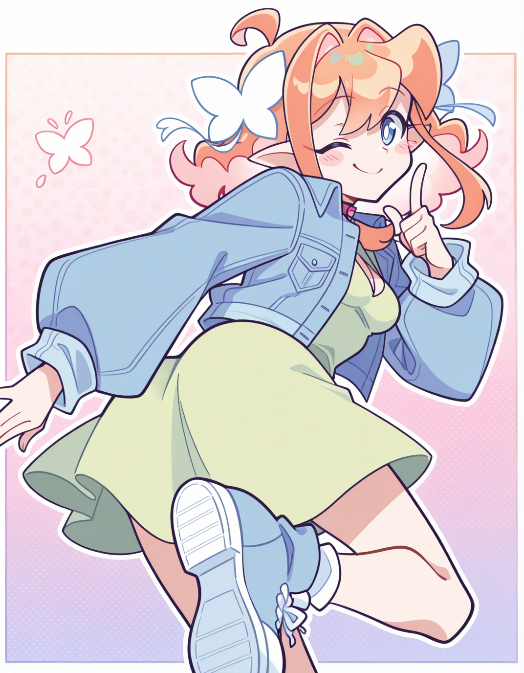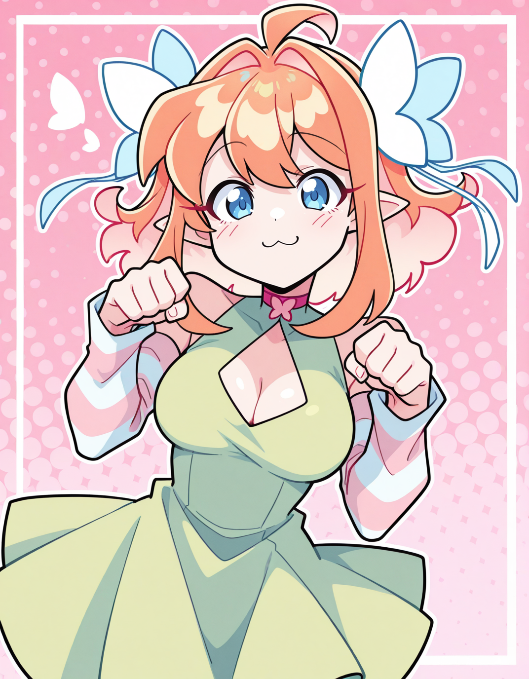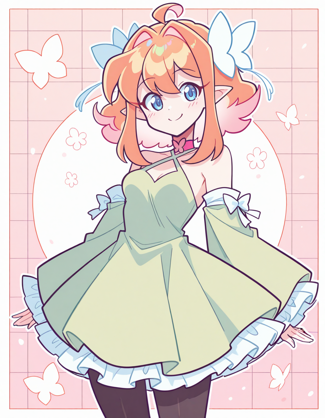 ActuallyReaNew, blue eyes, Orange hair, Pink hair, multicolored hair, medium hair, ahoge, pointy ears, White butterfly hair ornament, White hair ribbon,|| Pink choker, green dress, cleavage cutout, White socks, blue footwear,