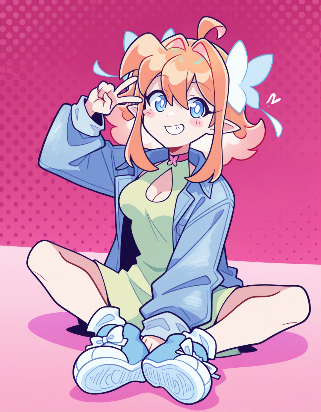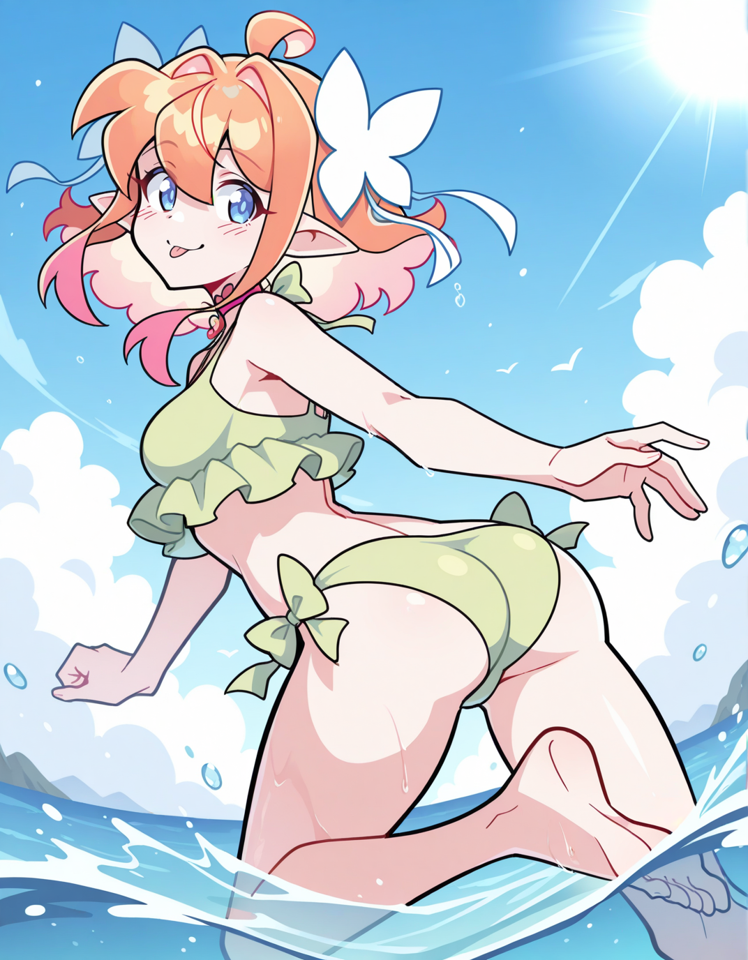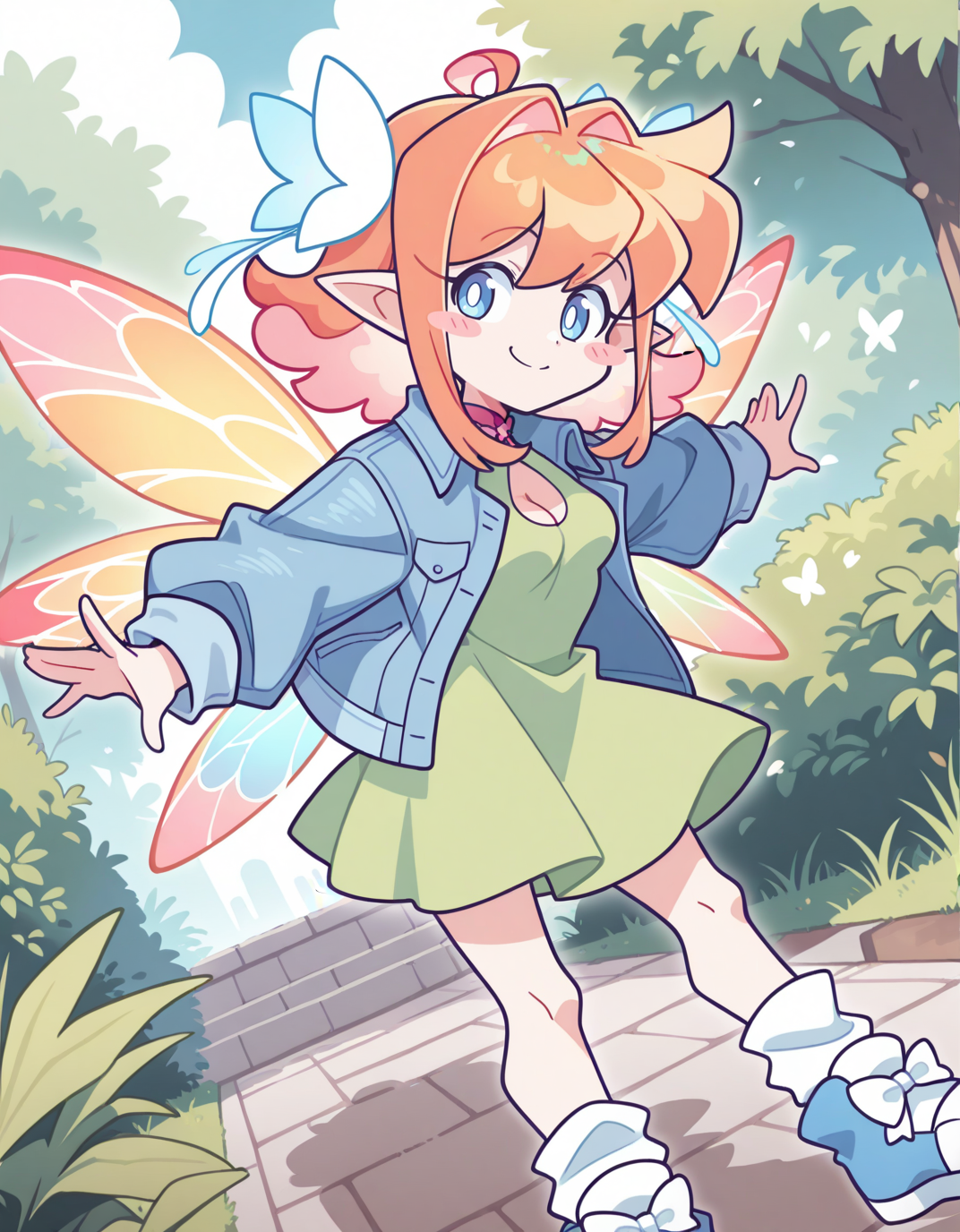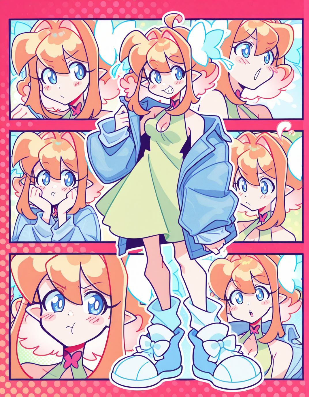 ActuallyReaNew, blue eyes, Orange hair, Pink hair, multicolored hair, medium hair, ahoge, pointy ears, White butterfly hair ornament, White hair ribbon,|| Pink choker, green dress, cleavage cutout, White socks, blue footwear,