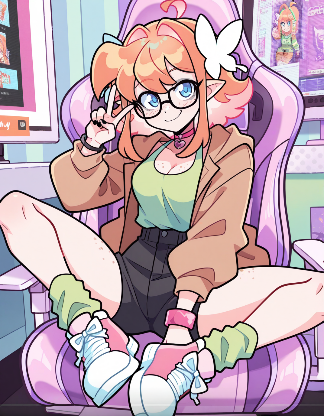 ActuallyRea, grey eyes, Orange hair, long hair, black-framed eyewear, freckles, grey eyeshadow, hair bow, White bow, black choker, heart choker, cleavage, green shirt, tank top, brown jacket, Hood down, short over long sleeves, striped sleeves, bracelet, black nails, black shorts, high-waist shorts, short shorts, green socks, Pink footwear, sneakers,