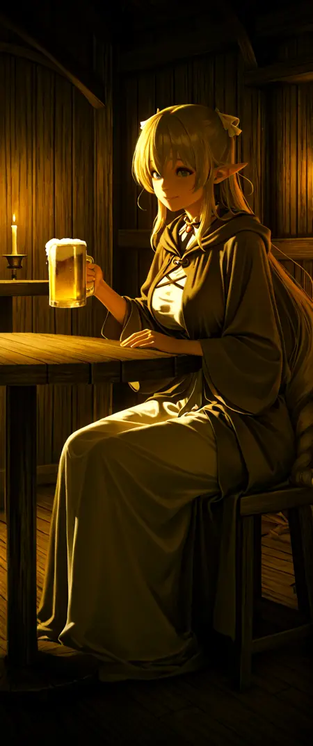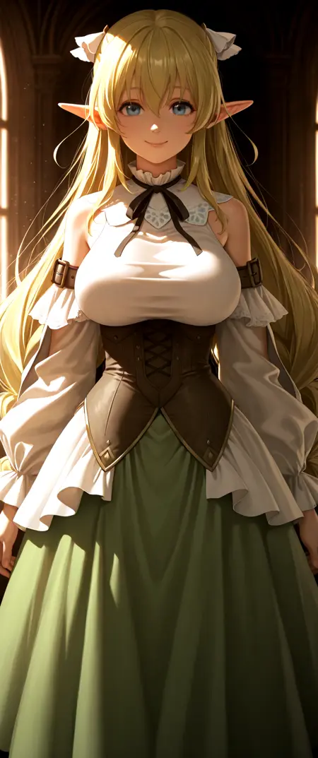スタンダードな外見: lilulu_(choyoyu), std_outfit, black_ribbon, brown_corset, detached_sleeves, green_skirt