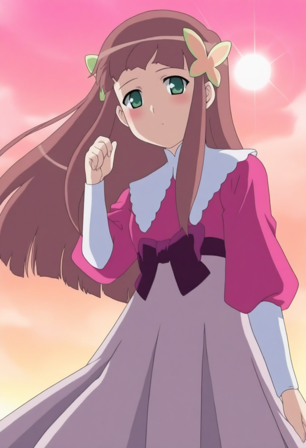 衣装: ピンクのシャツ、取り外し可能なカラーリング、ふんわりした長い袖、パープルのリボン、スカート、