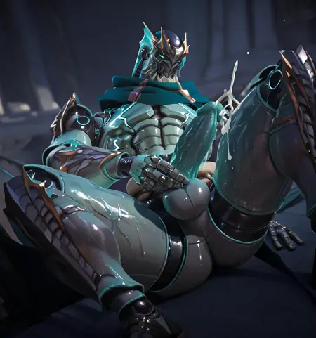(((男性))), 青い肌、ロボット、白いひげ、(青い目)、(((紫の触手のような髪))), 白い口ひげ、青い宝石とヒレがついた金の冠、筋肉質、筋肉質な太もも、体に青く輝く模様、内側は黒い肌、腰に白い巻き布、黒いペルテュゲ、鎧、膝当て、黒いサンダル、黒い腰下着、輝く目、(((完璧な目:1.9))),
