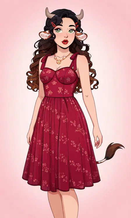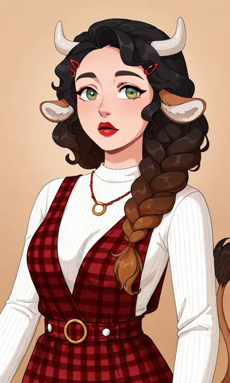 | 학습된 단어 | 1girl,long hair,single braid,curly hair,two-tone hair,gradient hair,black hair,brown hair, horns, cow ears,vitiligo,red lips,green eyes,hairclip, necklace,tail, plaid jacket, red jacket, crop top, white shirt, brown belt, denim shorts, high-waist shorts복사됨! |