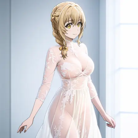 - 寝間着付きトリガー: GuideGirlSleeping, 1girl, yellow eyes, medium breasts, cleavage, nightgown, blonde hair, long hair, white dress, collarbone, cowboy shot