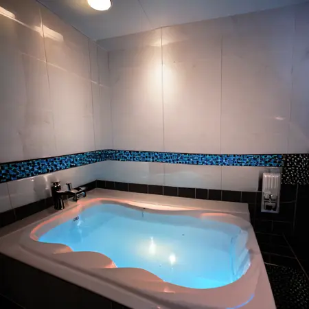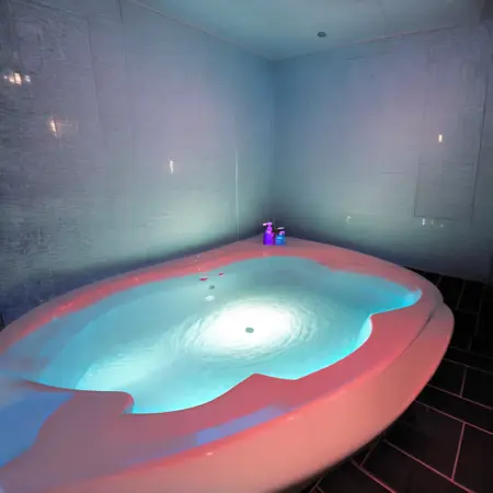 爱情旅馆的浴室通常都很大,足以容纳两人,且常配备喷射式按摩浴缸、LED灯光等豪华功能。本次的浴室LoRA,我努力实现了能生成具有标志性灯光效果的浴缸。