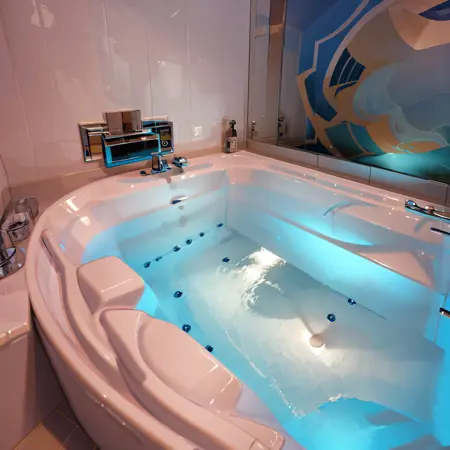 ラブホテルのお風呂は二人でも入れるくらい大きくて、ジェットバスやLEDライトによるライティング機能などが付いた豪華な浴槽が多いですよね。今回のお風呂LoRAでは、特徴的なライティング機能付きの浴槽を描けるように頑張りました。