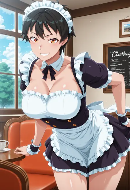 nishimuranao, woman, short hair, black hair, light-orange eyes, large breasts,