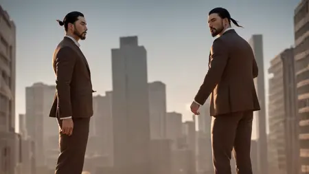 RAW photo,frowning,A neat blazer and a nice beard,best quality, adult, brown hair, , standing, dynamic pose, outdoors, city background,8k uhd, dslr, soft lighting, high quality, film grain,ow hanzo lora:hanzo\_vita:1