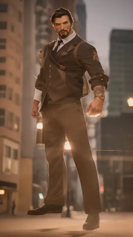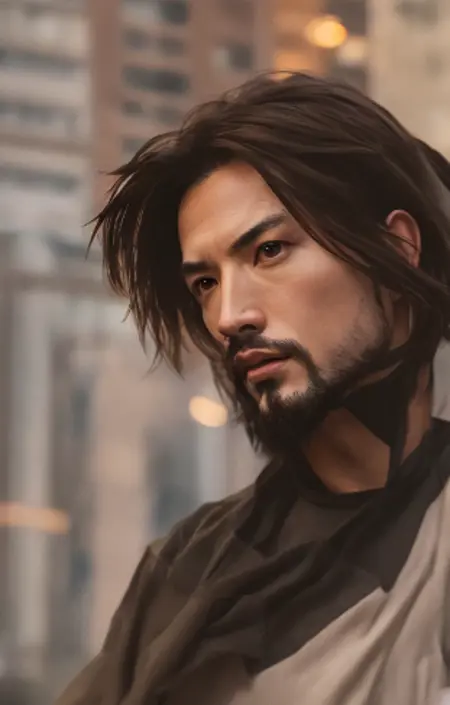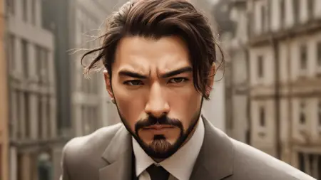RAW照片,皱眉,整齐的西装外套和漂亮的胡须,最佳质量,成年人,棕色头发,站立,动态姿势,户外,城市背景,8K UHD,单反相机,柔和光线,高质量,胶片颗粒,ow hanzo lora:hanzo_vita:1
