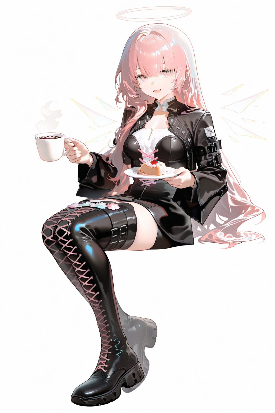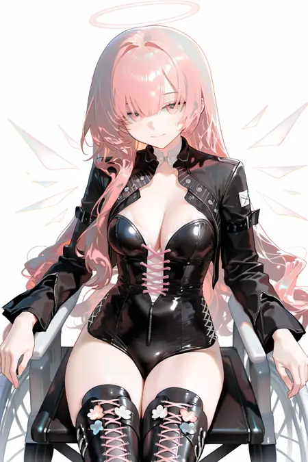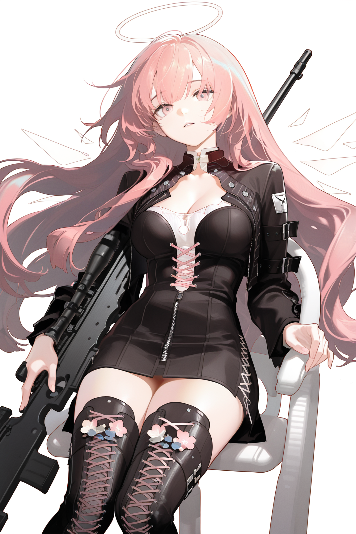 lemuen \(明日方舟\),1girl,粉发,粉眼,单人,长发,光环,大腿靴,靴子,过膝靴,能量翅膀,黑色夹克,交叉绑带鞋履,脱离的翅膀,翅膀,夹克,长袖,交叉绑带服装,黑色鞋履,连衣裙,系带靴,黑色过膝靴,椅子,黑色连衣裙,