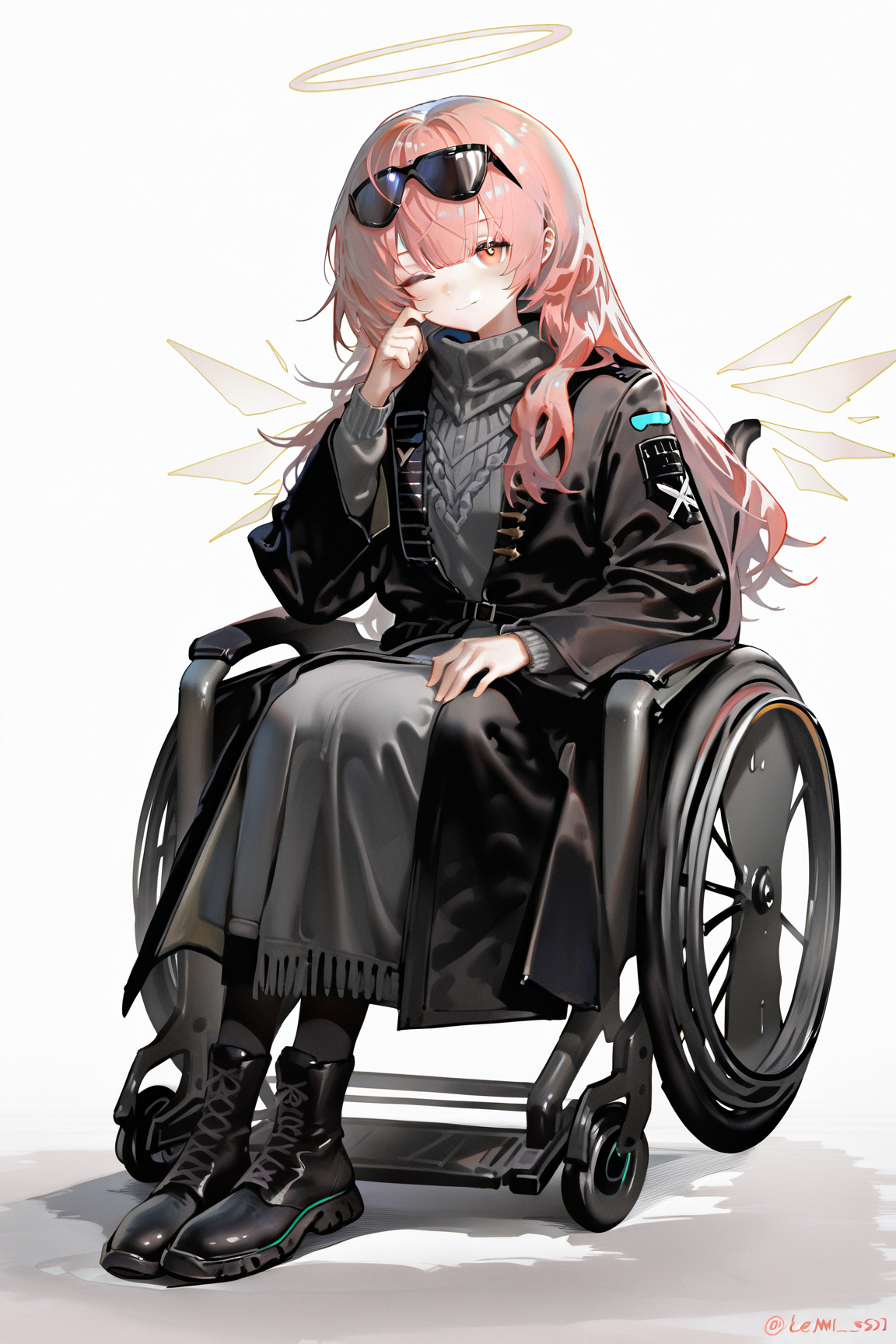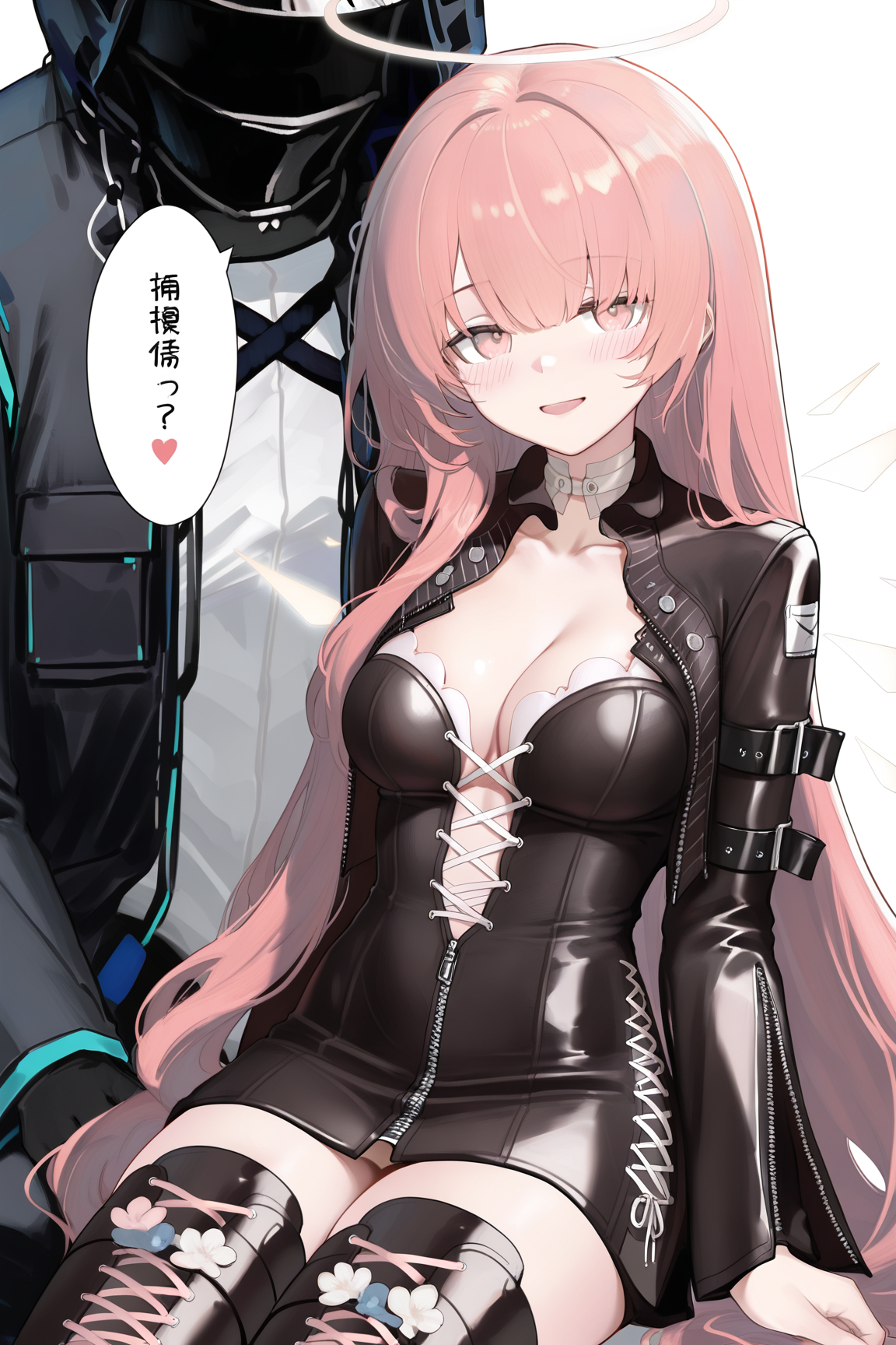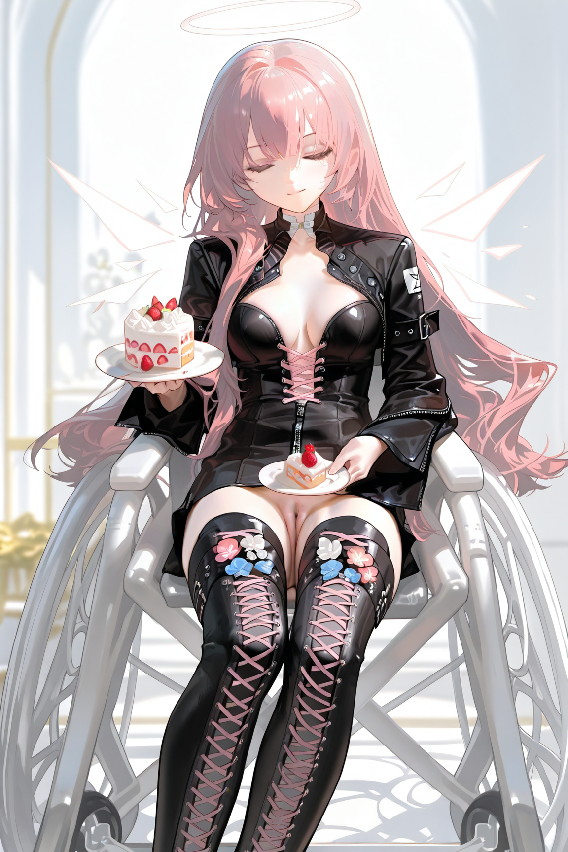 lemuen \(明日方舟\),1girl,粉发,粉眼,单人,长发,光环,大腿靴,靴子,过膝靴,能量翅膀,黑色夹克,交叉绑带鞋履,脱离的翅膀,翅膀,夹克,长袖,交叉绑带服装,黑色鞋履,连衣裙,系带靴,黑色过膝靴,椅子,黑色连衣裙,
