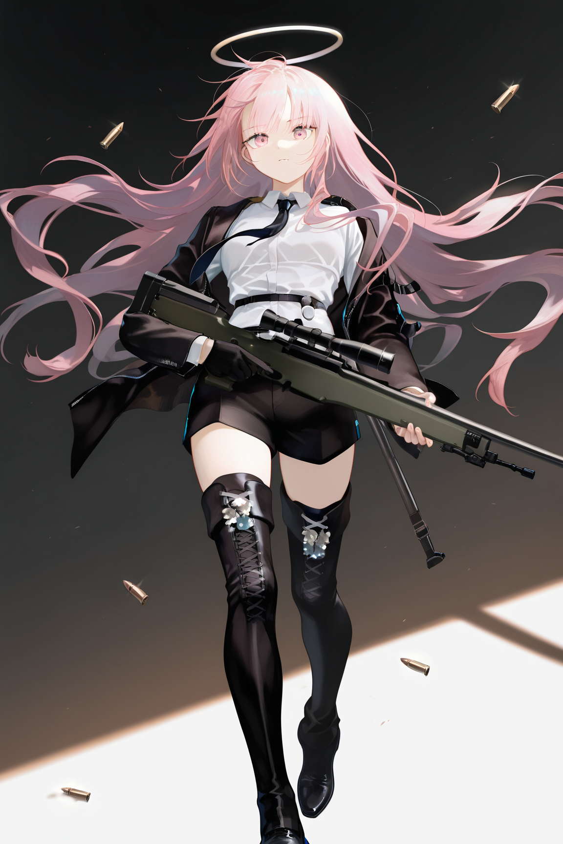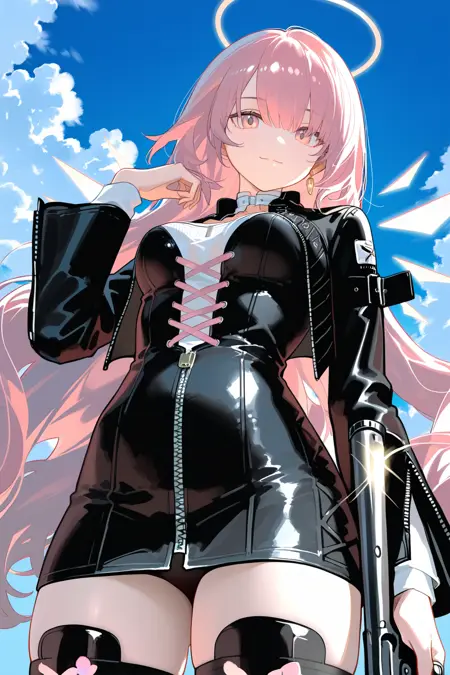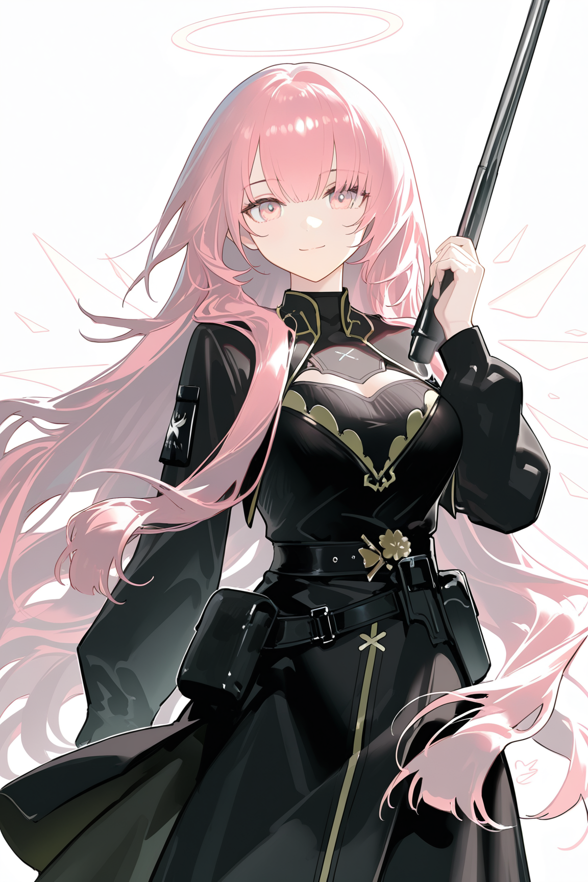 lemuen \(明日方舟\),1girl,粉发,粉眼,单人,长发,光环,能量翅膀,黑色夹克,脱离的翅膀,翅膀,夹克,长袖,交叉绑带服装,连衣裙,黑色连衣裙,