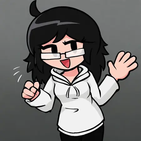 Talia,黑发,白色连帽衫,黑色裤子,眼镜